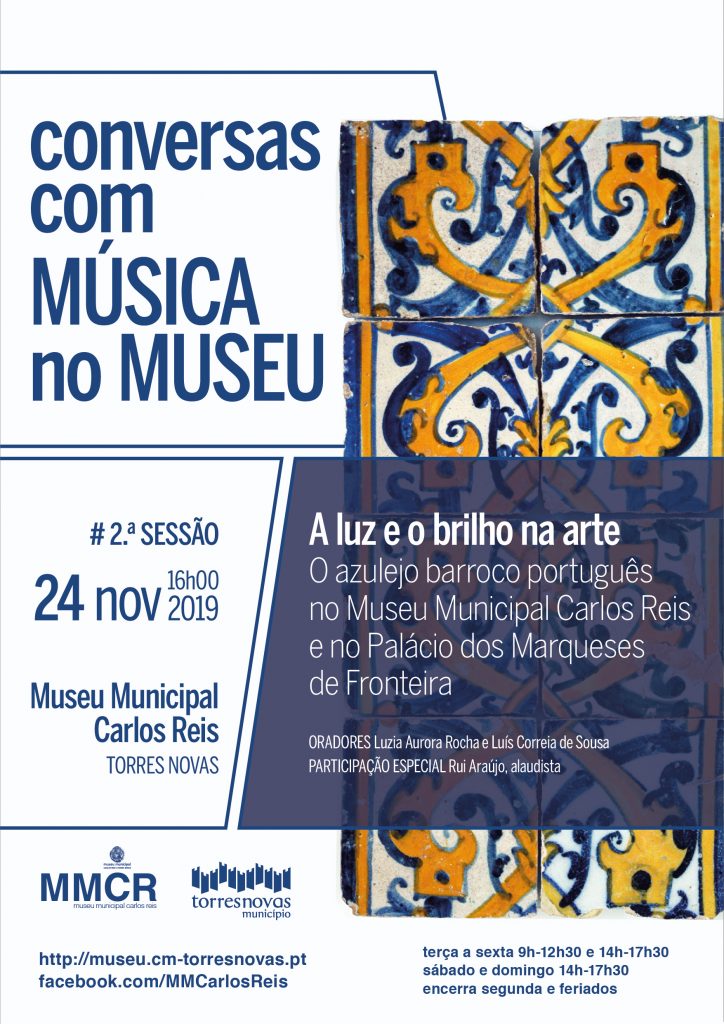 O Museu Municipal Carlos Reis possui nas suas colecções azulejo polícromo português (padrão) dos finais do século XVII. A partir da peça do museu viajar-se-á pelo mundo de erudição e sátira que marcam os azulejos do Palácio dos Marqueses de Fronteira. Esta sessão contará com uma análise e descrição da peça do museu e centrar-se-á grandemente nos temas musicais representados no Palácio Fronteira. Contará ainda com um pequeno recital de alaúde com música da época barroca.