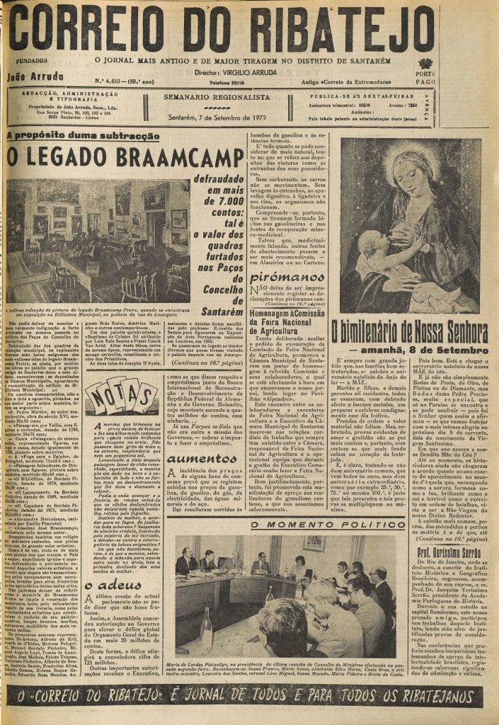 Na edição de 7 de Setembro de 1979, o Correio do Ribatejo fazia manchete com um dos episódios mais tristes da história patrimonial de Santarém: o furto de dez quadros e de um valioso relógio de mármore do legado Braamcamp Freire, então depositados nos Paços do Concelho, enquanto decorriam obras de remodelação na Biblioteca Municipal. Sob o título «O Legado Braamcamp», o jornal denunciava, em letras garrafais, que o concelho fora «defraudado em mais de 7.000 contos» — uma quantia significativa para a época, correspondente ao valor estimado das obras furtadas — e relatava, com veemente indignação, o sucedido.