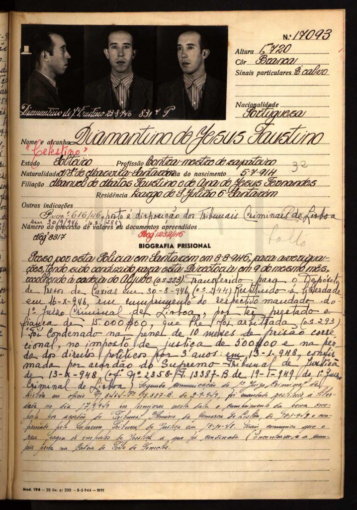 Diamantino de Jesus Faustino, conhecido no reviralho como “Celestino”, nasceu na freguesia de Marvila a 5 de Julho de 1914, sendo filho de Manuel de Matos Faustino e de Ana de Jesus Fernandes. Este sapateiro residia no largo de S. Julião, 6, em Santarém e foi preso para averiguações pela polícia dessa cidade, a 8 de Agosto de 1946. Daí, foi enviado, no dia seguinte, para o Aljube e, a 30 de Agosto 1946, para Caxias. A 16 de Outubro desse ano foi libertado para iniciar o cumprimento da pena, a 13 de Janeiro de 1948, em Peniche onde permaneceu até 17 de Setembro de 1949.