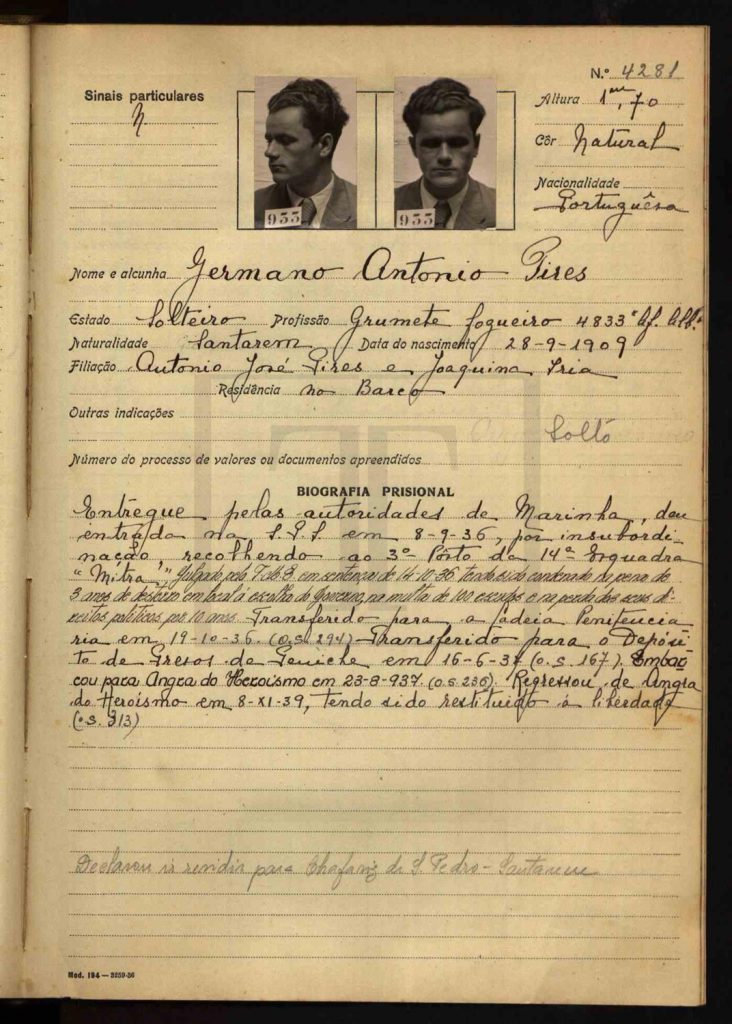 Germano António Pires nasceu em Santarém, a 28 de Setembro de 1909, sendo filho de António José Pires e de Joaquina Iria. Este era grumete fogueiro no navio da Marinha Portuguesa “Afonso de Albuquerque”, daí que residia “nos barcos”. Ele foi detido por insubordinação, a 8 de Setembro de 1936, sendo entregue pelas autoridades da Marinha. A 19 de Outubro de 1936, encontrava-se detido na Cadeia Penitenciária e, daí, partiu para Peniche, onde se manteve entre 16 de Junho e 23 de Agosto de 1937, quando foi enviado para Angra do Heroísmo. Quando foi libertado a 8 de Novembro de 1939, declarou que ia “residir para Chafariz de S. Pedro, em Santarém”.
