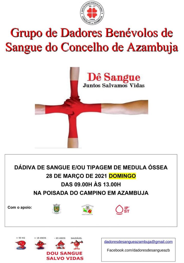 O Grupo de Dadores Benévolos de Sangue do Concelho de Azambuja vai realizar mais uma recolha de sangue. Desta feita, a iniciativa terá lugar na manhã de domingo, dia 28 de Março, nas instalações da Poisada do Campino em Azambuja e conta com a colaboração e supervisão do Instituto Português do Sangue e da Transplantação.