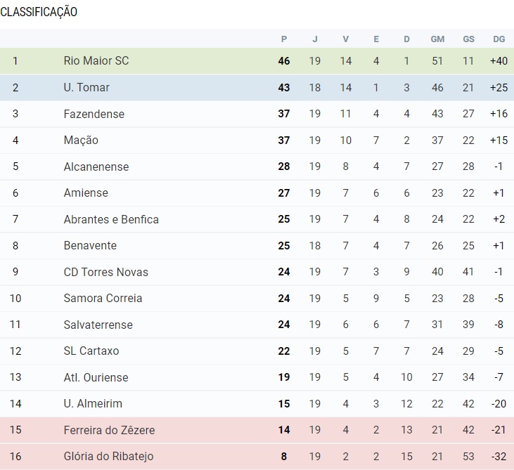 O União de Tomar comprometeu a vantagem que tinha sobre a equipa do Rio Maior, tendo perdido em casa por 1-2 frente ao Samora Correia. Os nabantinos tem um jogo em atraso com o Benavente e vencendo estão em igualdade de pontos com o actual líder.