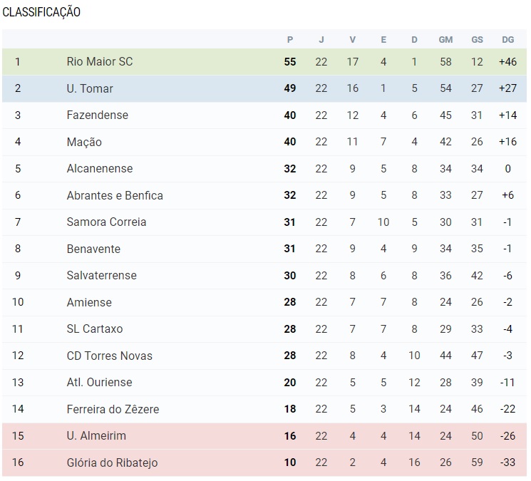 O Rio Maior venceu o União de Tomar, seu rival na luta pelo título, por 2-1 e estendeu para seis pontos a vantagem na frente da tabela classificativa à 22ª jornada da 1ª divisão do campeonato distrital da Associação de Futebol de Santarém, quando faltam apenas oito jornadas para o final da competição.