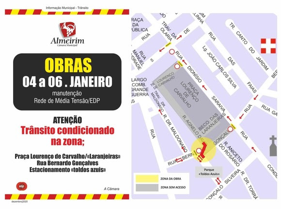 As ruas adjacentes à Praça Lourenço de Carvalho (Laranjeiras), em Almeirim, encontram-se encerradas ao trânsito entre hoje e a próxima quarta-feira, 6 de Janeiro, devido a obras de manutenção da rede de média tensão da EDP.