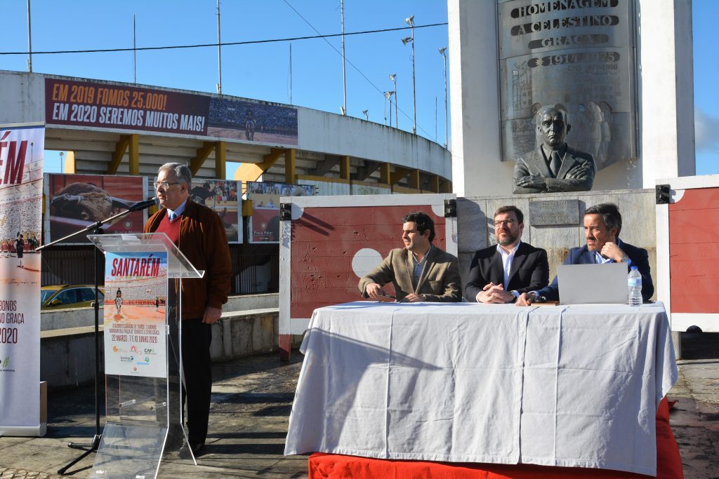 A Associação “Praça Maior” apresentou oficialmente na manhã deste sábado, dia 25 de Janeiro, a temporada de 2020 na Monumental “Celestino Graça”, em Santarém durante uma sessão pública que levou a efeito, pelas 11 horas, junto ao busto erigido em homenagem a este saudoso ribatejano de tão grata memória e até S. Pedro ajudou à festa brindando os presentes com uma solarenga manhã, facto notado logo na abertura da apresentação por Diogo Palha, da Praça Maior: “S. Pedro é um verdadeiro aficionado”, afirmou, historiando de seguida o surgimento da Associação, o ano passado, disposta a “inverter o ciclo de degradação que estava criado” em redor da Monumental.