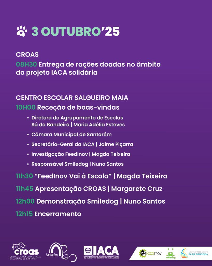 As comemorações prosseguem às 10h00, no Centro Escolar Salgueiro Maia, com uma Receção de boas-vindas, a cargo de Maria Adélia Esteves, Diretora do Agrupamento de Escolas Sá da Bandeira, que conta com a participação de Jaime Piçarra, Secretário-Geral da IACA – Associação Portuguesa dos Industriais de Alimentos Compostos para animais, Magda Teixeira, da FeedInov – associação sem fins lucrativos, sediada na Estação Zootécnica Nacional, Polo INIAV de Santarém, de Nuno Santos, da Smiledog – centro de desenvolvimento destinado a terapia assistida por cães.