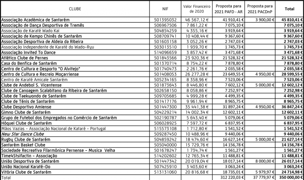O Município de Santarém vai atribuir um apoio financeiro de 350 mil euros aos clubes e associações desportivas do concelho, no âmbito do Regulamento de Apoio e Financiamento do Associativismo Desportivo (RAFAD).