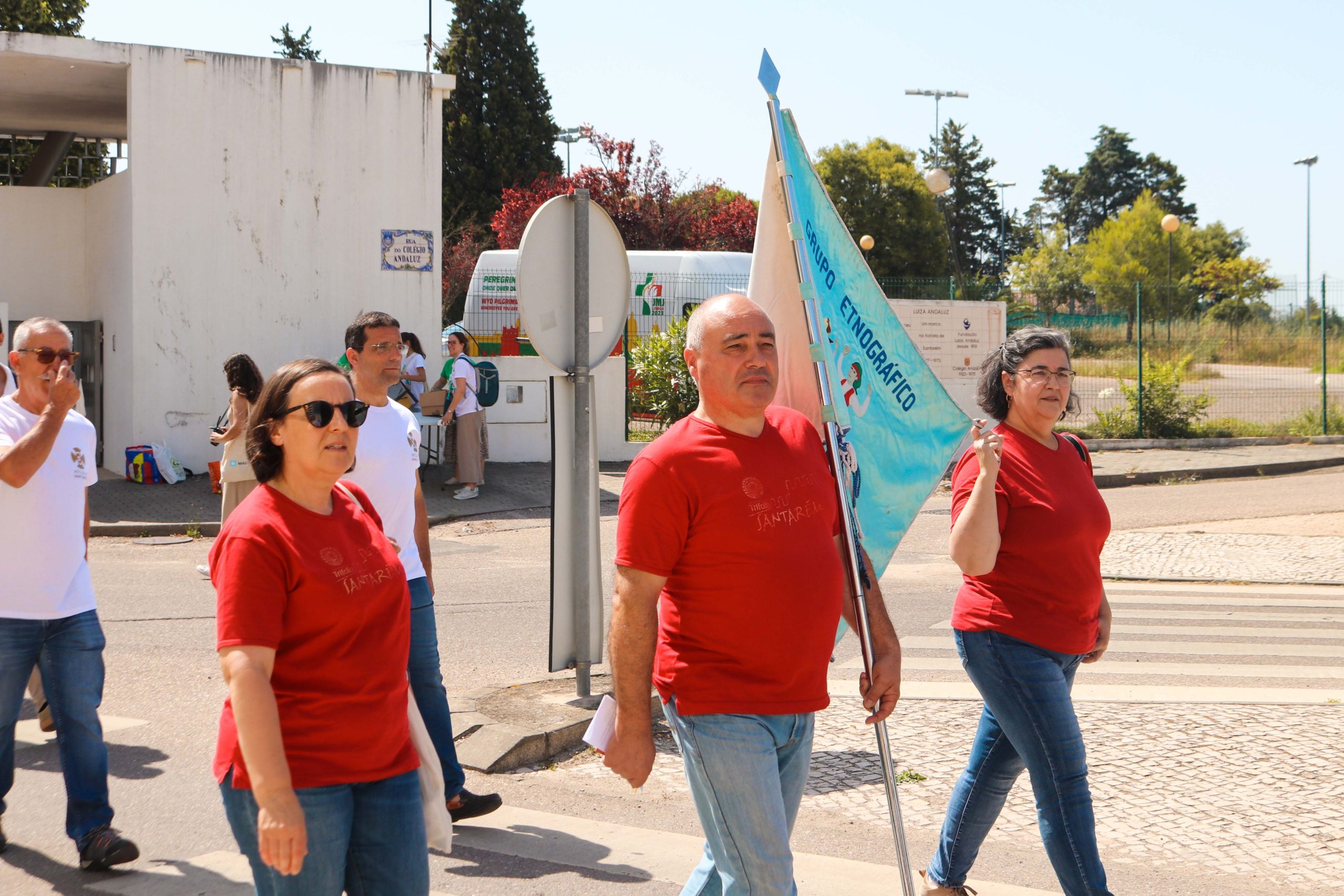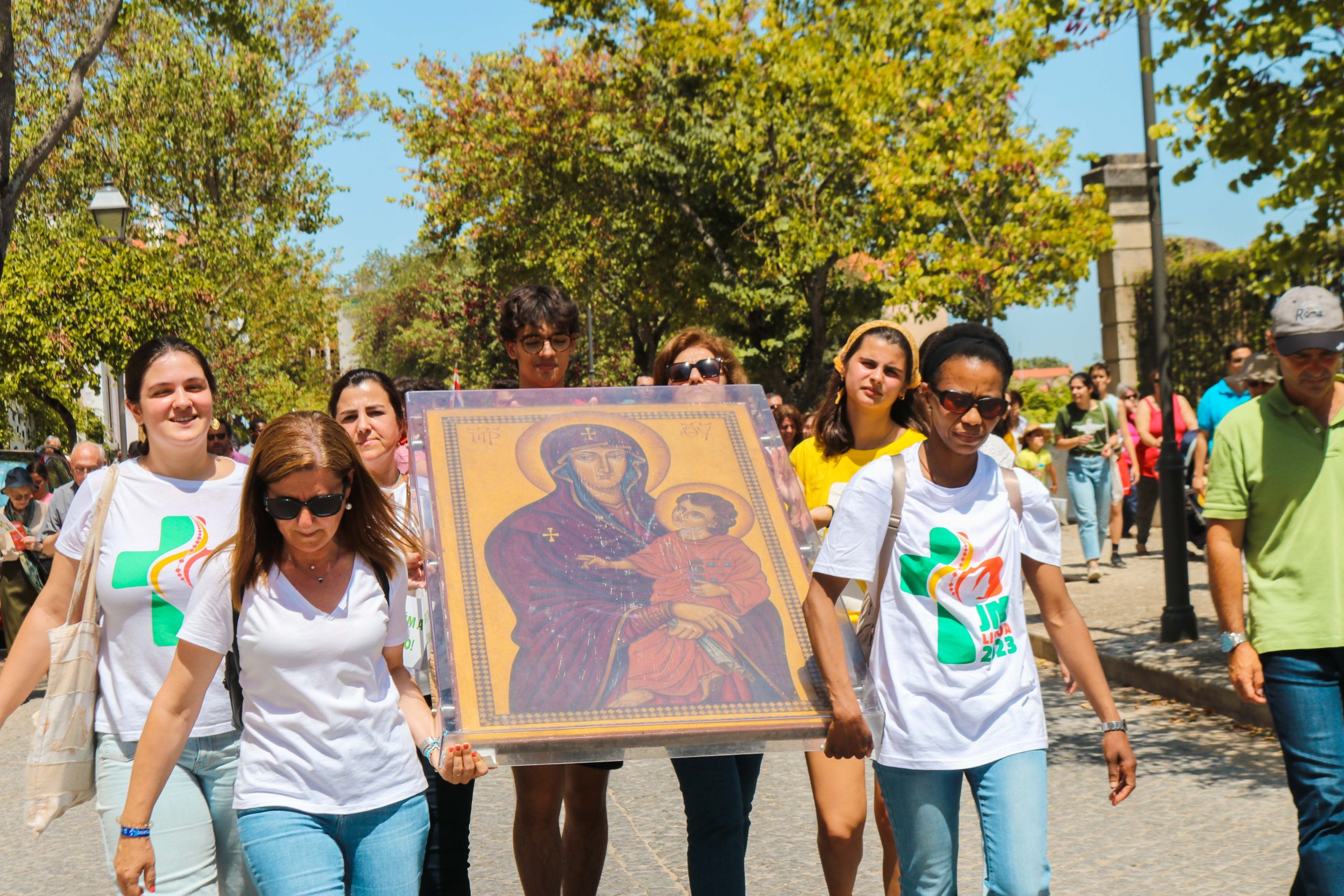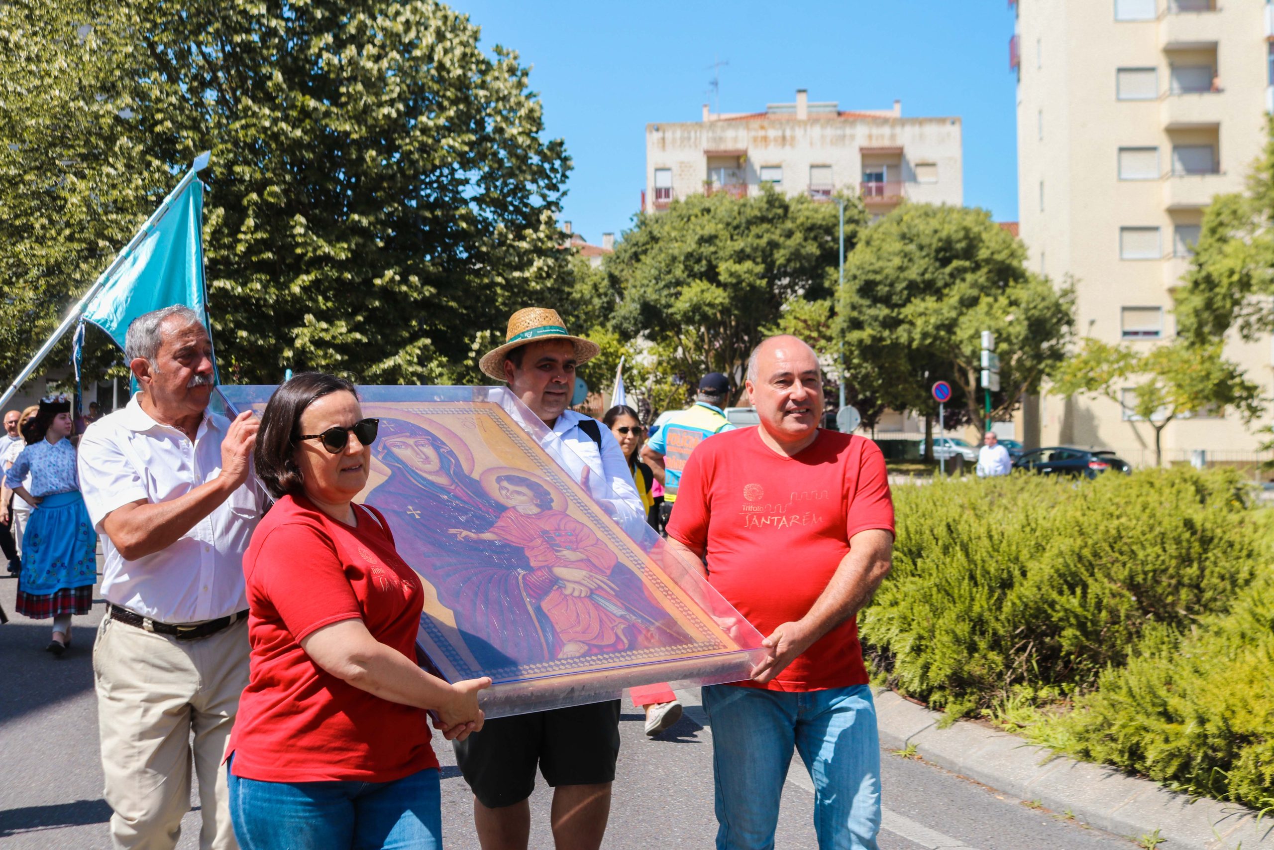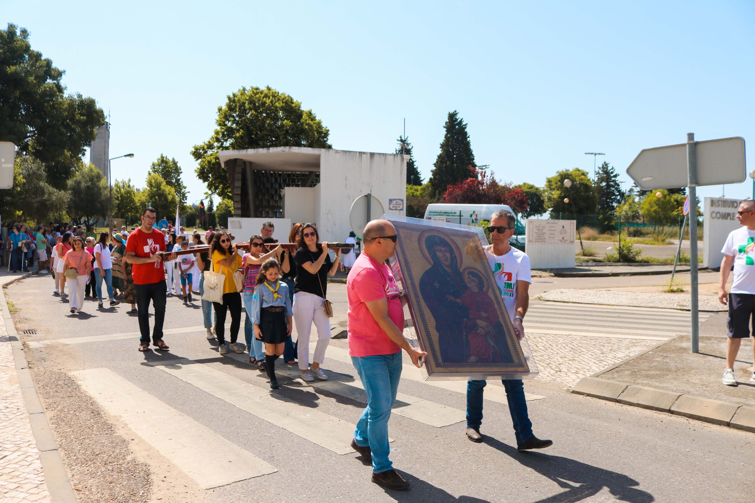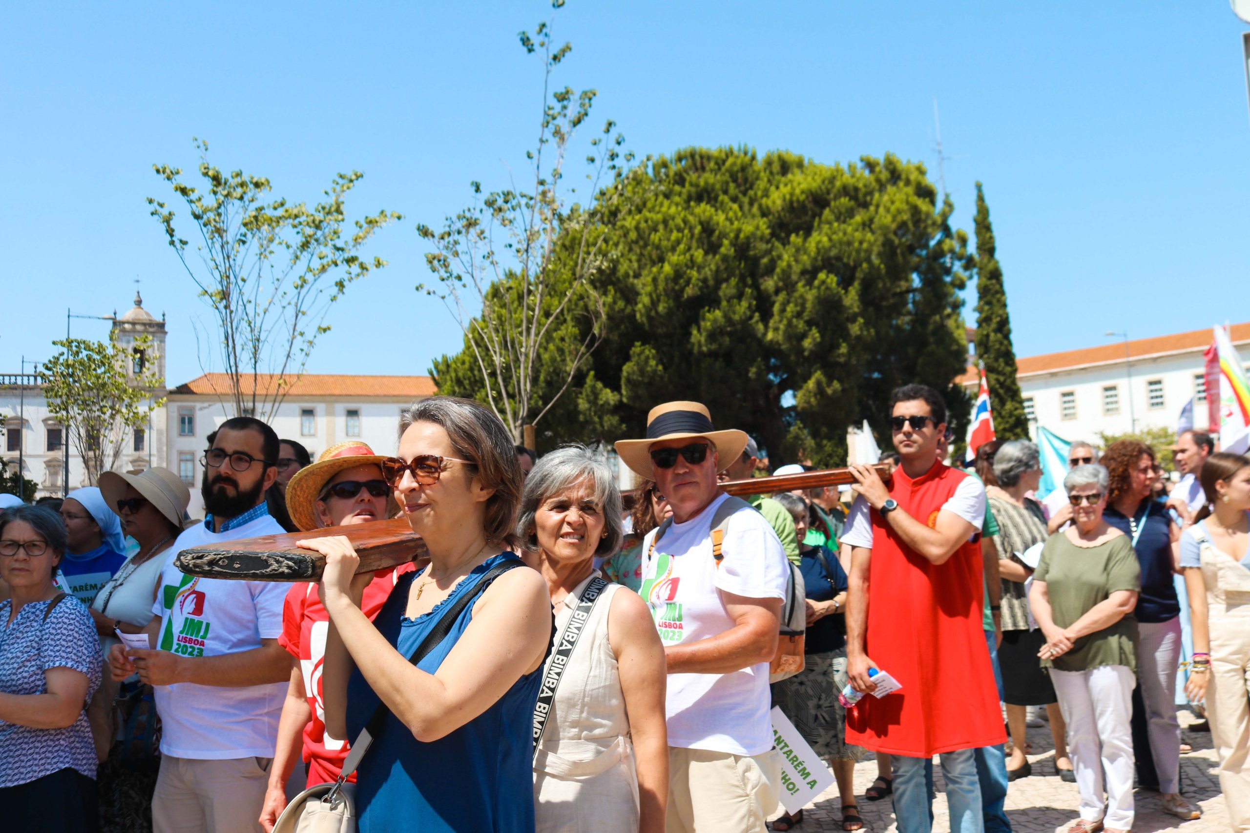 Ao som do hino oficial da Jornada Mundial da Juventude, foram cerca de 30 entidades, religiosas e não religiosas, da cidade de Santarém que carregaram a cruz peregrina, com 3,8 metros de altura, e o ícone de Nossa Senhora Salus Populi Romani, com 1,20 metros de altura e 80 centímetros de largura.