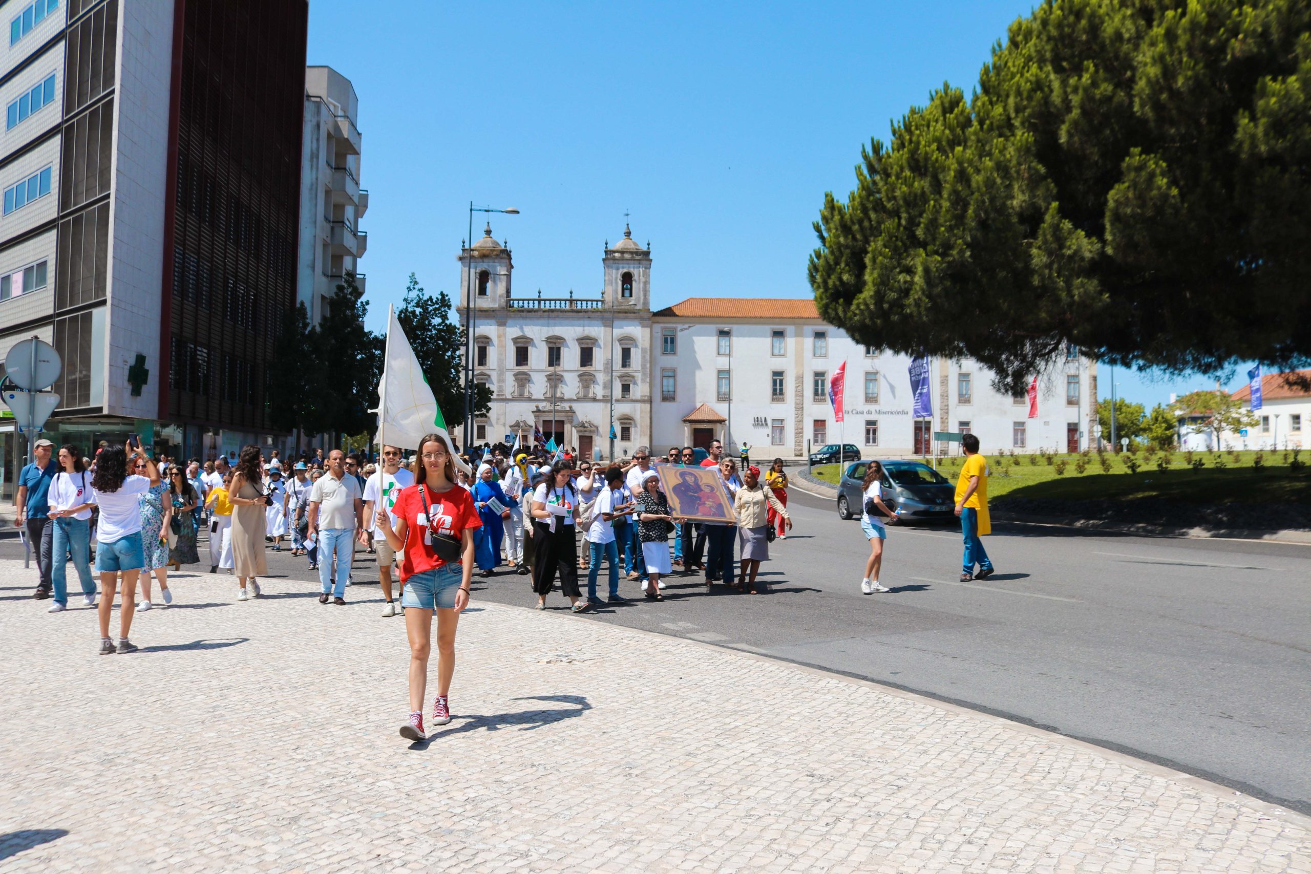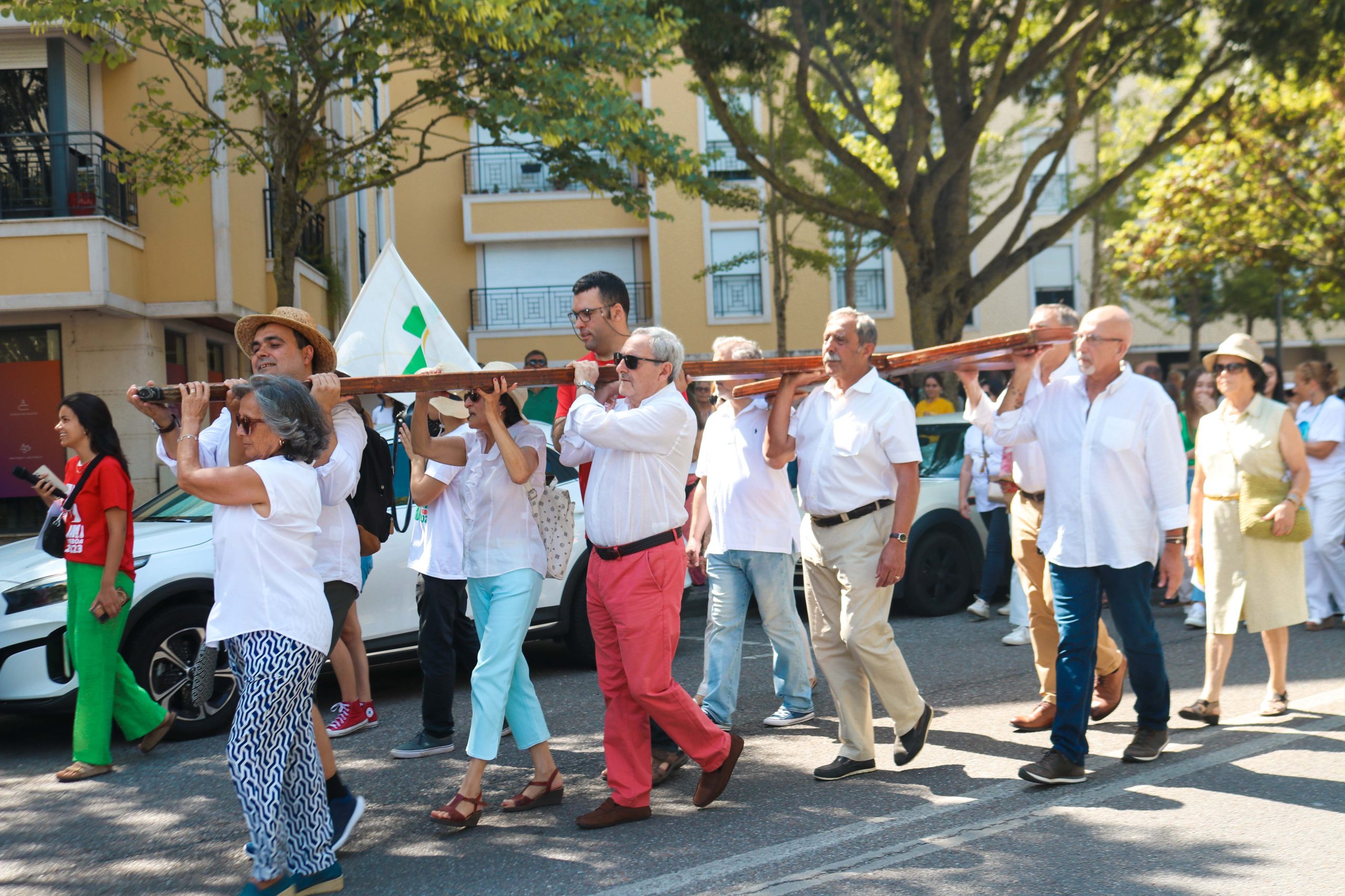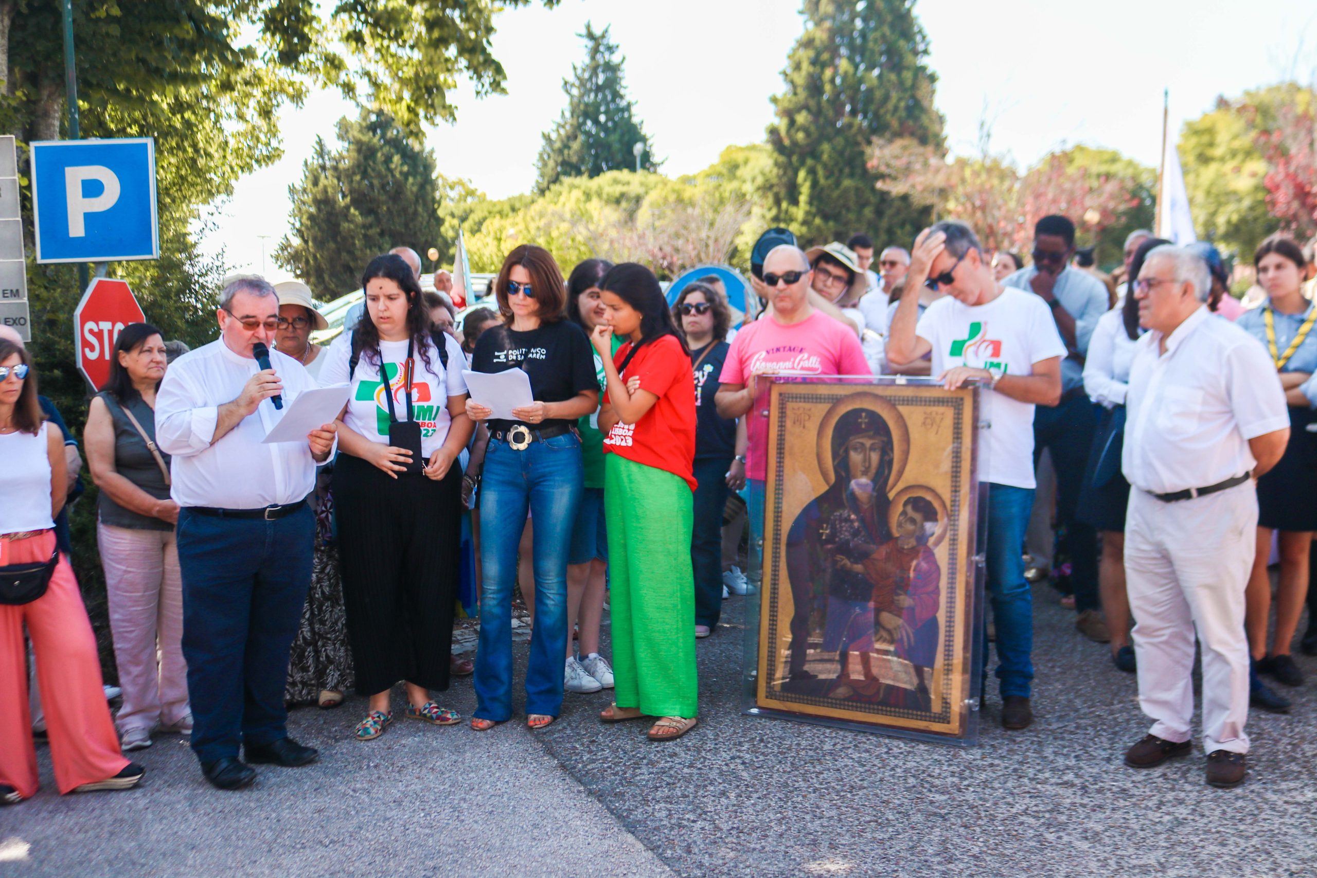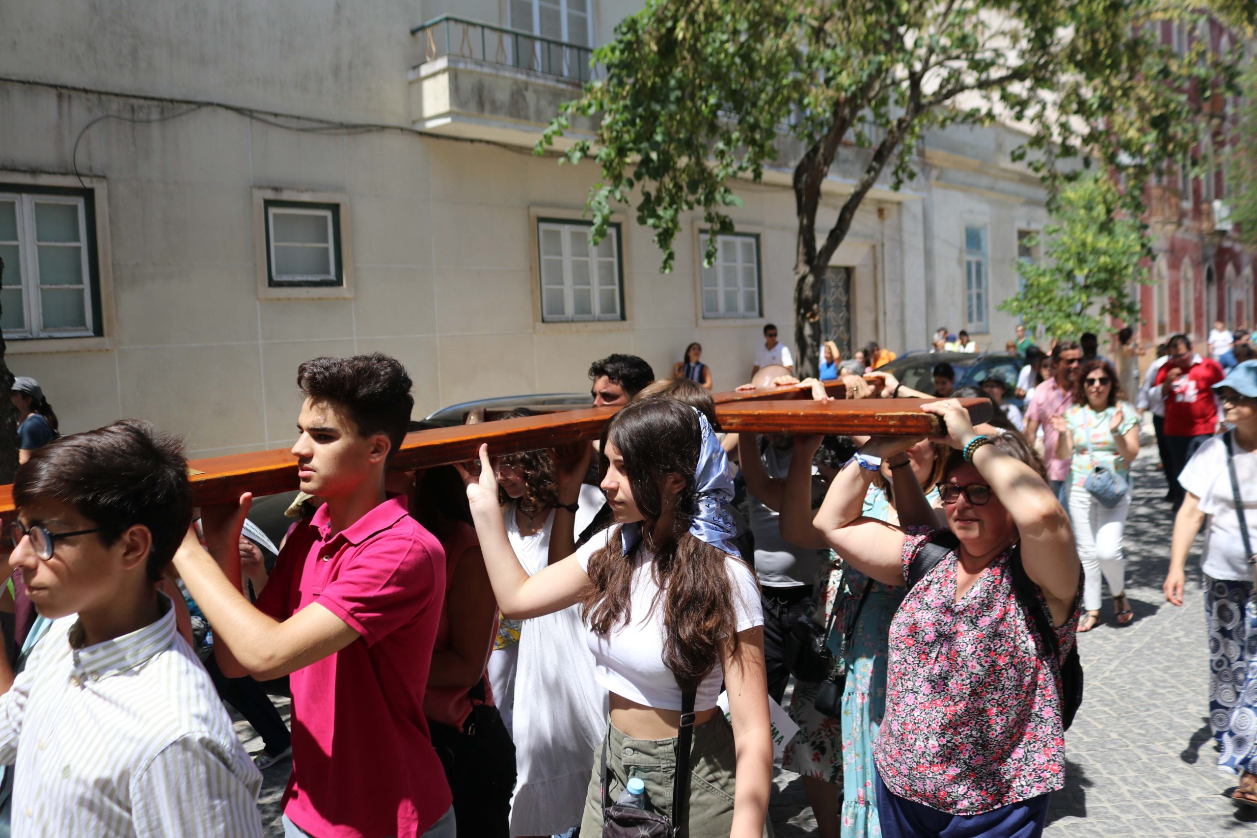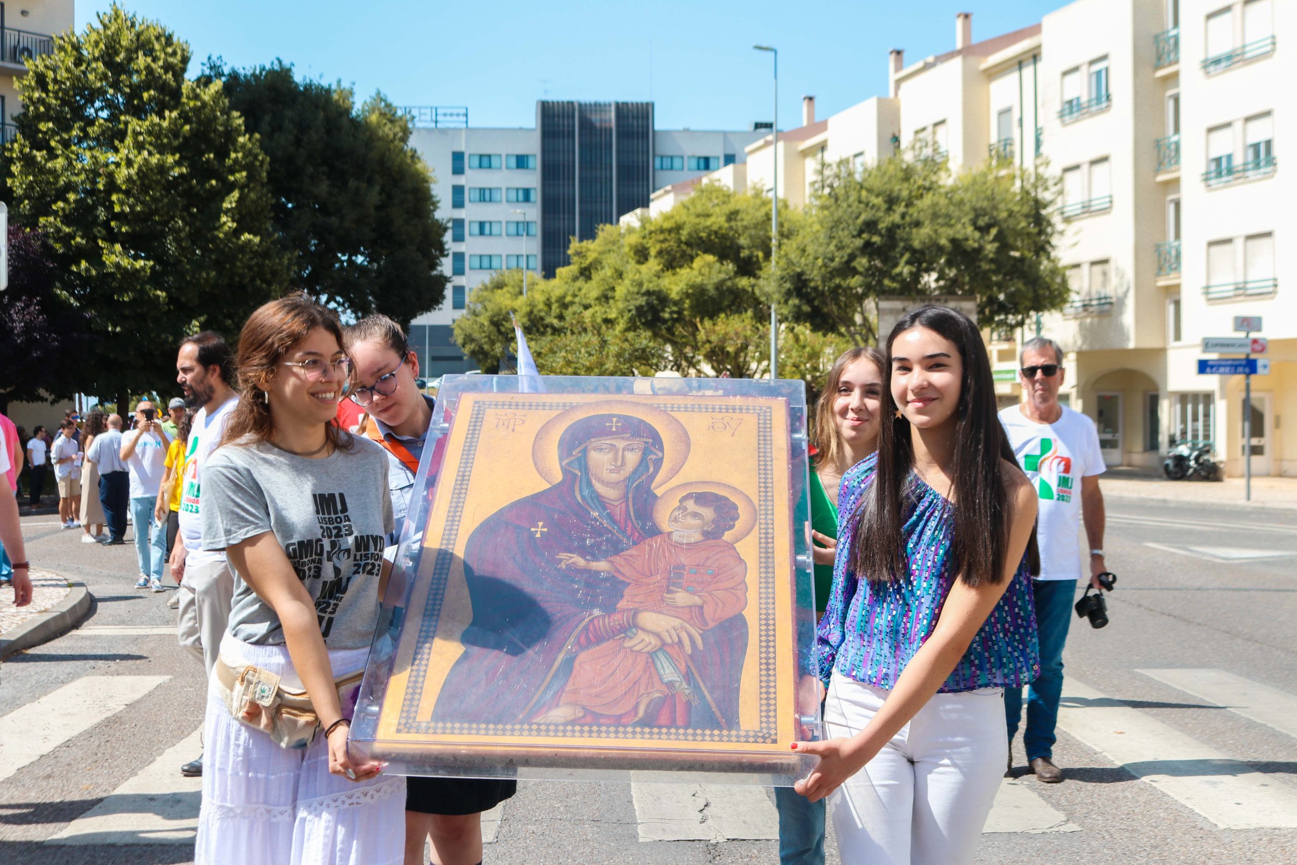 Ao som do hino oficial da Jornada Mundial da Juventude, foram cerca de 30 entidades, religiosas e não religiosas, da cidade de Santarém que carregaram a cruz peregrina, com 3,8 metros de altura, e o ícone de Nossa Senhora Salus Populi Romani, com 1,20 metros de altura e 80 centímetros de largura.