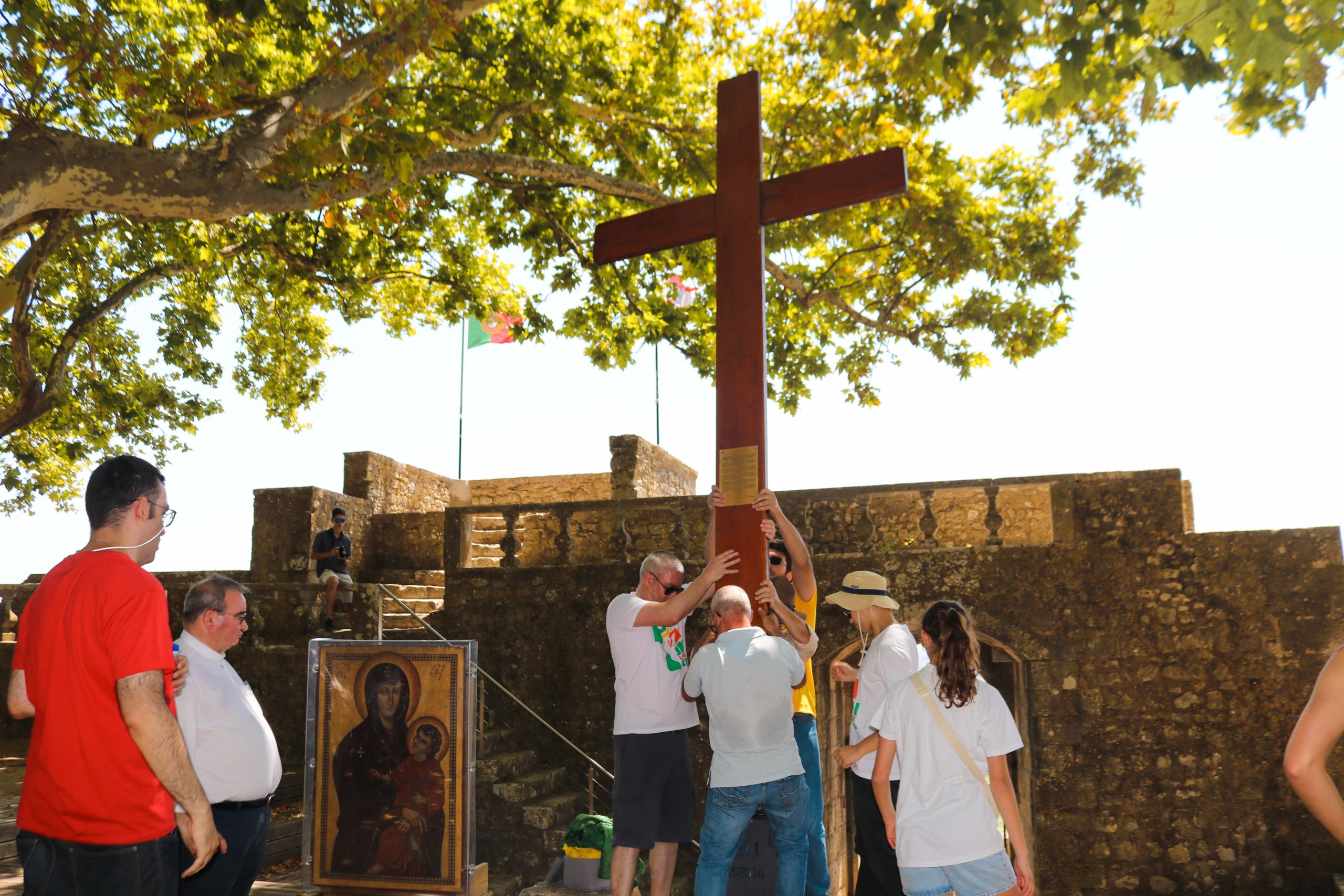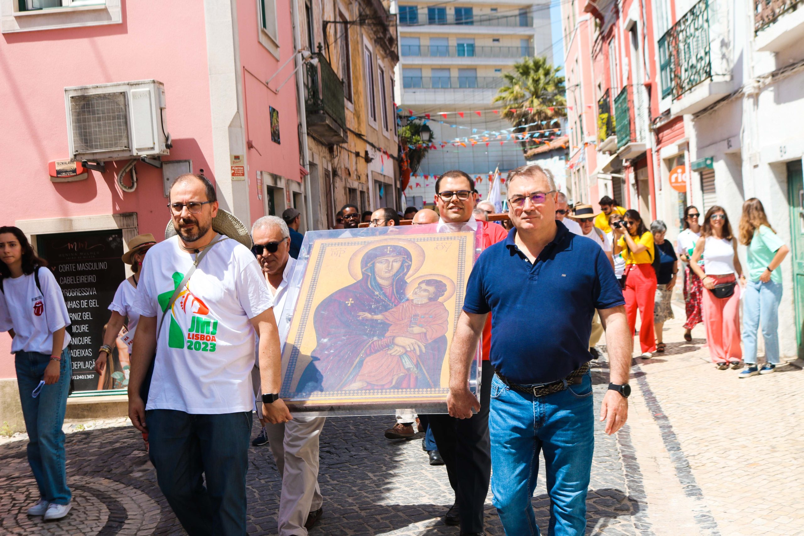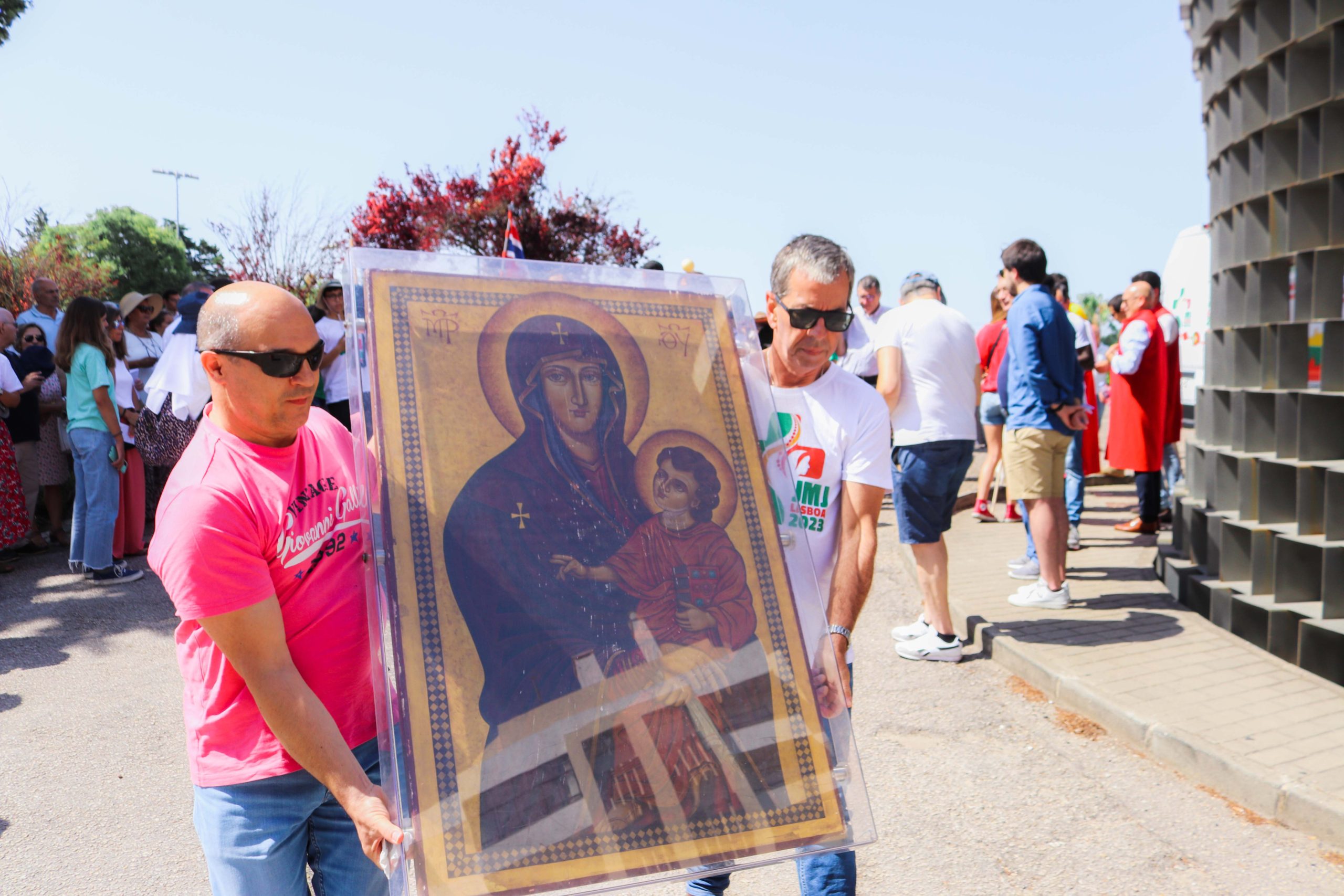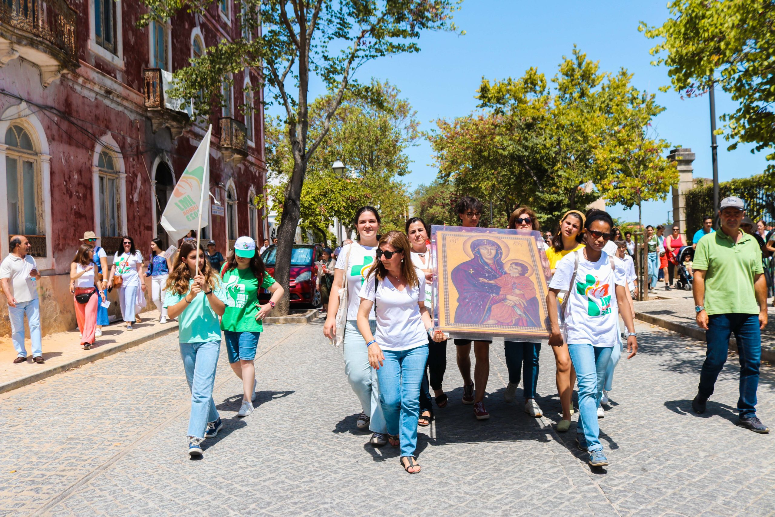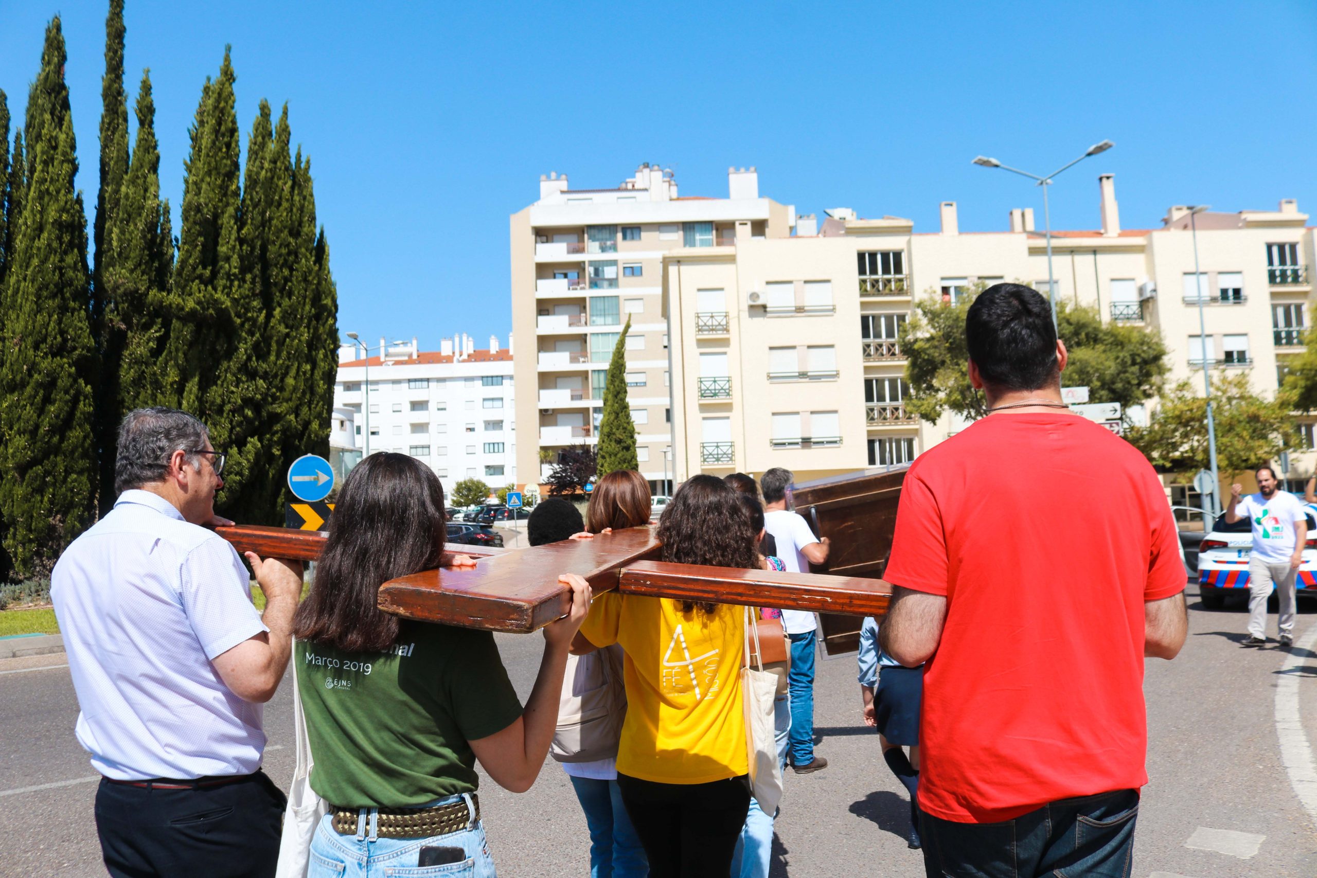 Ao som do hino oficial da Jornada Mundial da Juventude, foram cerca de 30 entidades, religiosas e não religiosas, da cidade de Santarém que carregaram a cruz peregrina, com 3,8 metros de altura, e o ícone de Nossa Senhora Salus Populi Romani, com 1,20 metros de altura e 80 centímetros de largura.