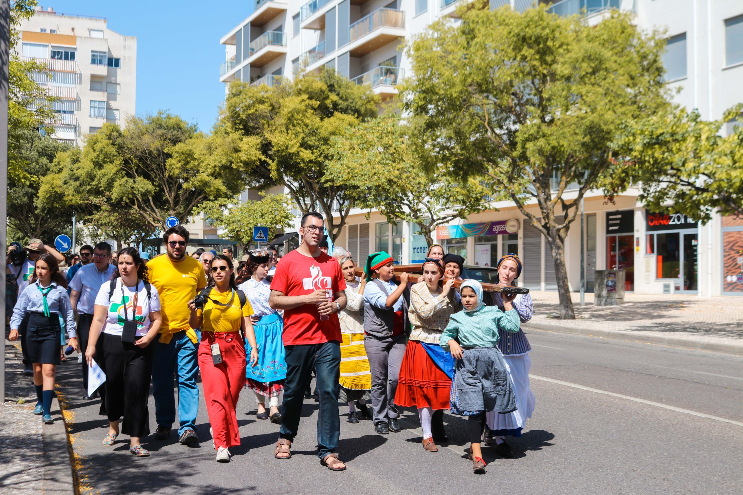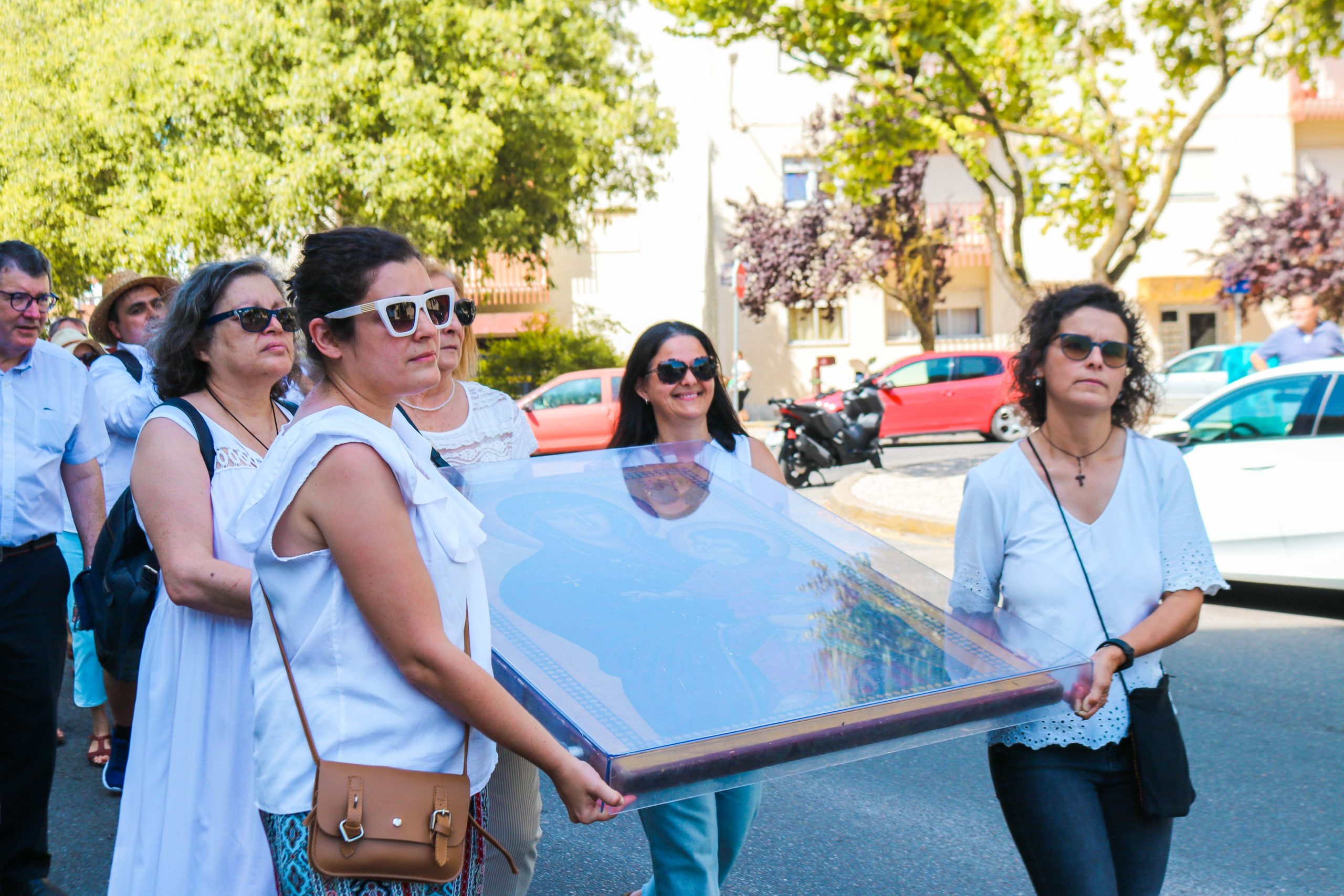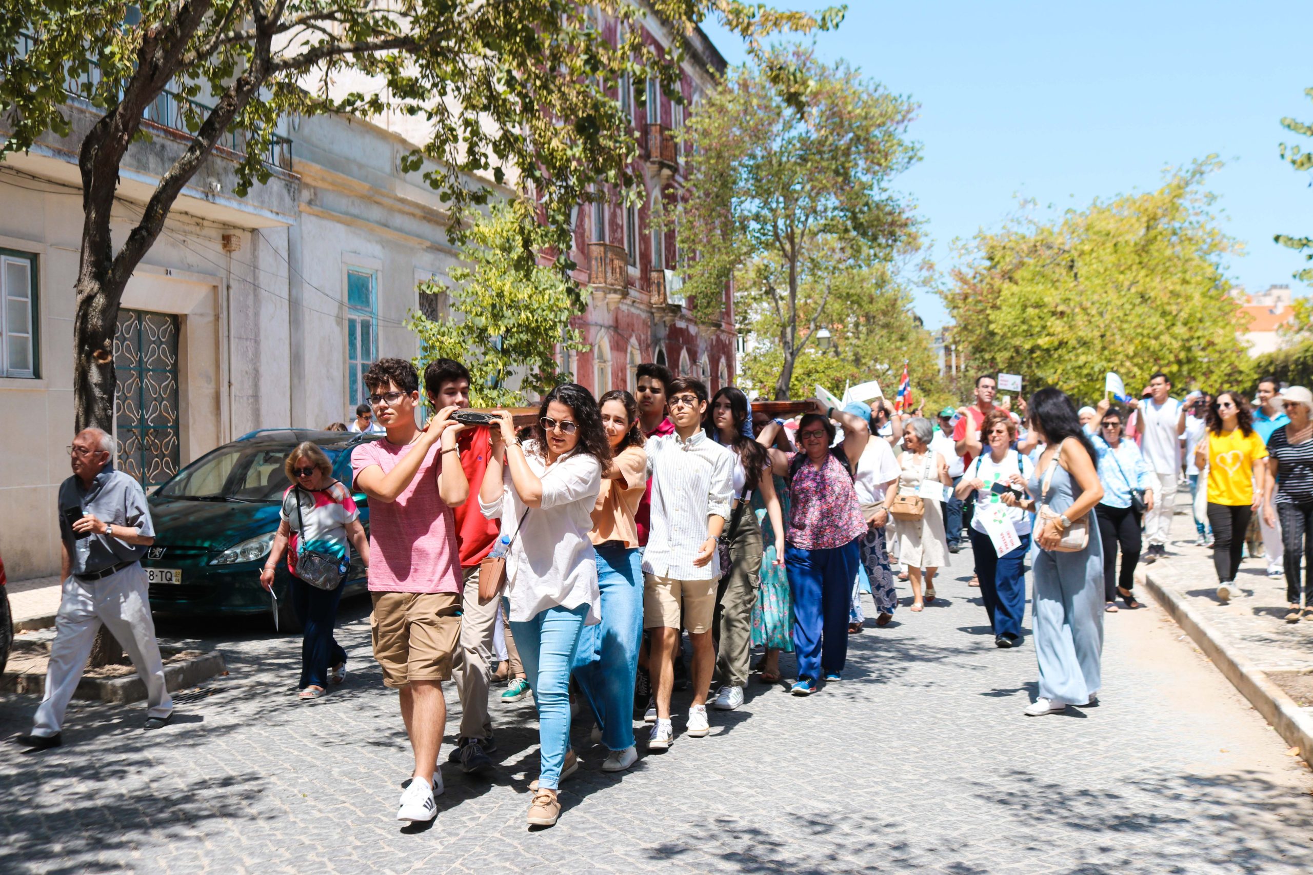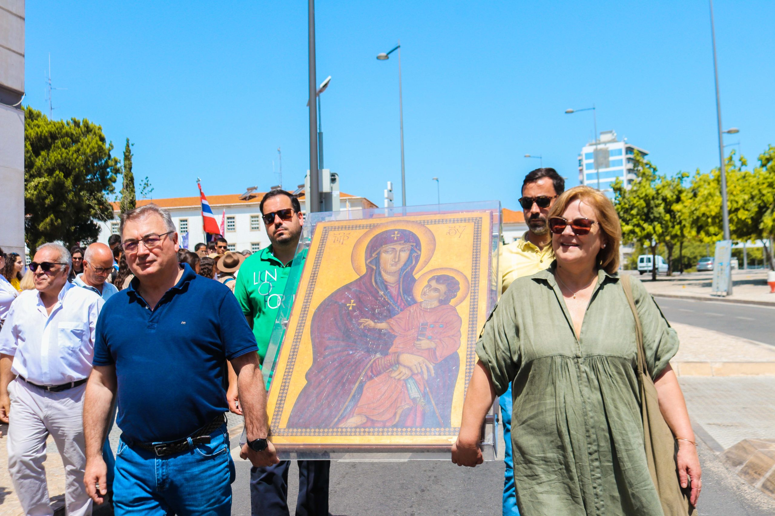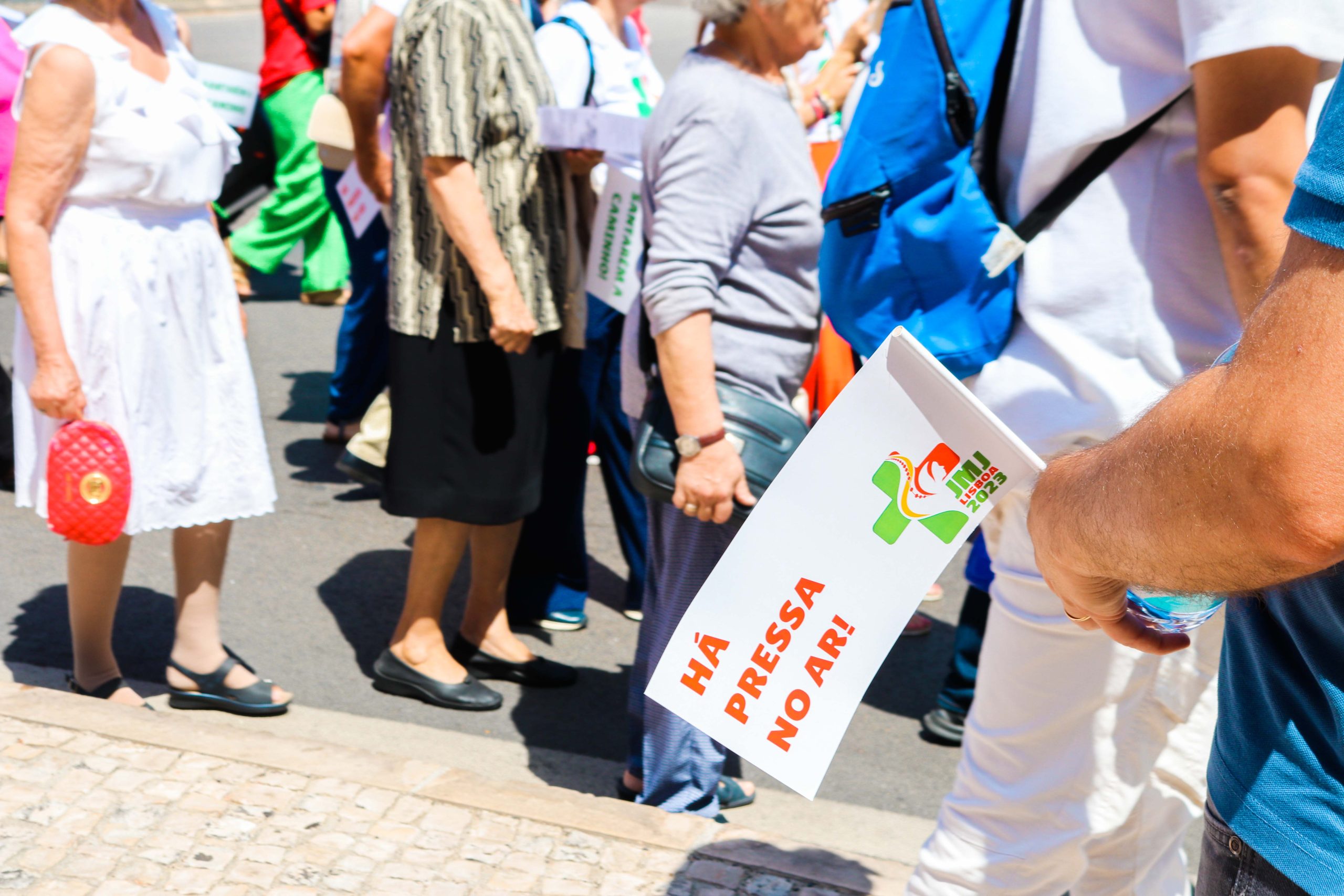 Ao som do hino oficial da Jornada Mundial da Juventude, foram cerca de 30 entidades, religiosas e não religiosas, da cidade de Santarém que carregaram a cruz peregrina, com 3,8 metros de altura, e o ícone de Nossa Senhora Salus Populi Romani, com 1,20 metros de altura e 80 centímetros de largura.