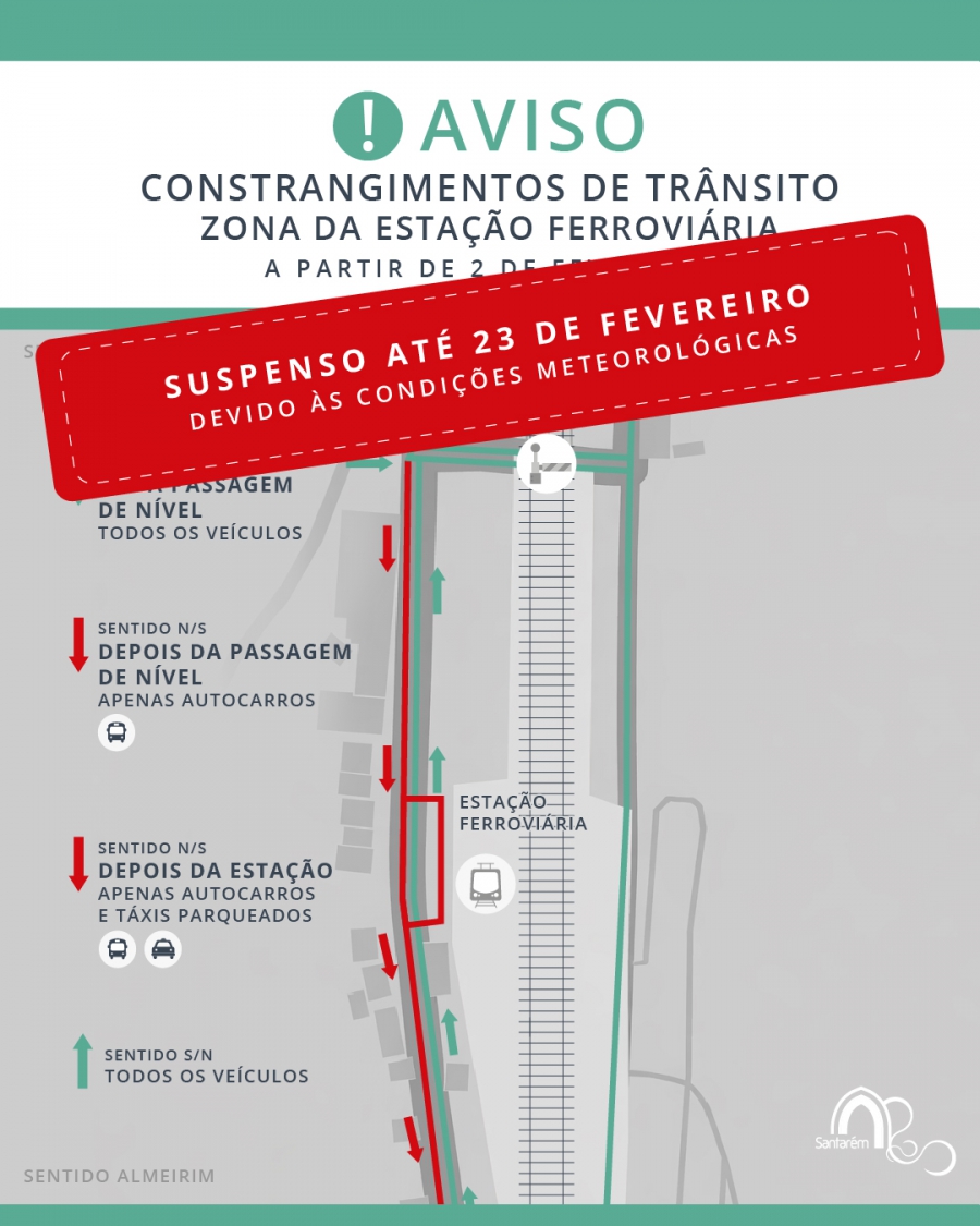 O Município de Santarém informa que, devido às condições meteorológicas adversas registadas nos últimos dias, foi decidida a suspensão temporária do aviso relativo aos condicionamentos de trânsito na zona da Estação Ferroviária, anteriormente anunciado.
