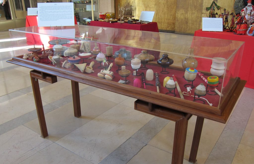 Piões, sim, de todo o mundo, cerca de 800, com pesos compreendidos entre os cinco quilos e a grama, esse o mais pequeno do mundo de natureza e formas de lançamento diversas, de cordel, magnéticos, de célula, de mola, mecânicos, de fricção, de campainha, eu sei lá…