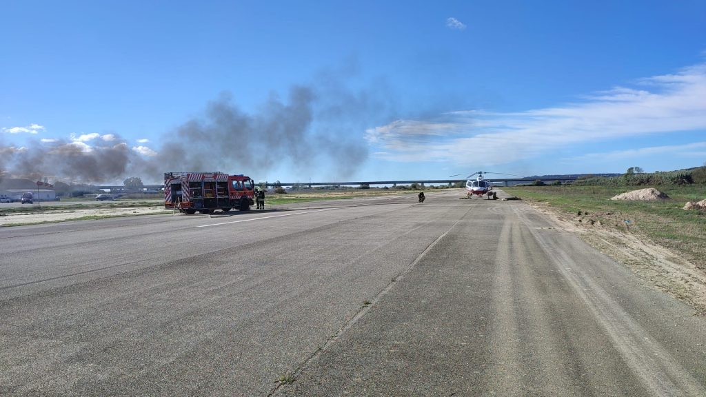 Durante o simulacro, foi accionado um helicóptero de combate a incêndios para uma ocorrência em Biscainho, Coruche, mas, ao regressar, o helicóptero sofreu um incêndio no motor, obrigando a uma aterragem de emergência. Durante a aterragem, colidiu com um avião civil que tentava descolar sem autorização, situação que levantou suspeitas à PSP. A polícia mobilizou cerca de vinte agentes, que, ao apreenderem um passageiro em fuga, identificaram armas e 50 quilos de estupefacientes a bordo do avião.