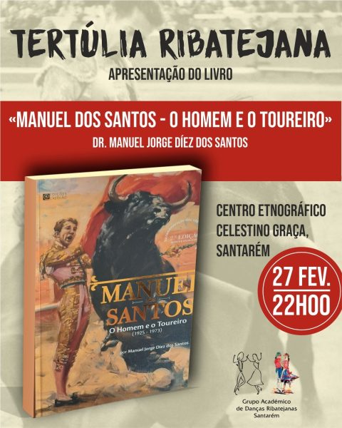 O Grupo Académico de Danças Ribatejanas promove, no dia 27 de Fevereiro, a partir das 22h00, mais uma sessão da sua Tertúlia Ribatejana, dedicada à figura de Manuel dos Santos. A iniciativa inclui a apresentação da segunda edição do livro “Manuel dos Santos – O Homem e o Toureiro” e a exibição do documentário “Depois da Saudade”, realizado pelo mexicano Toto Martínez.