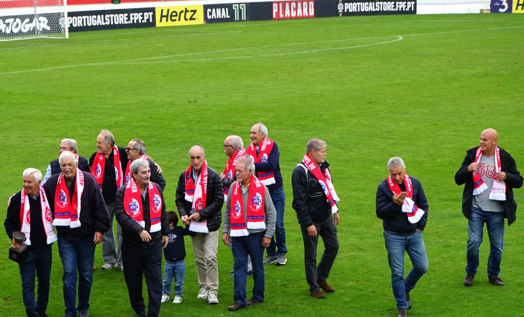 A União Desportiva de Santarém homenageou esta tarde, no intervalo do jogo frente ao Sporting da Covilhã, que a turma Scalabitana perdeu por uma bola a zero, os Campeões Nacionais da temporada 1974/75.
