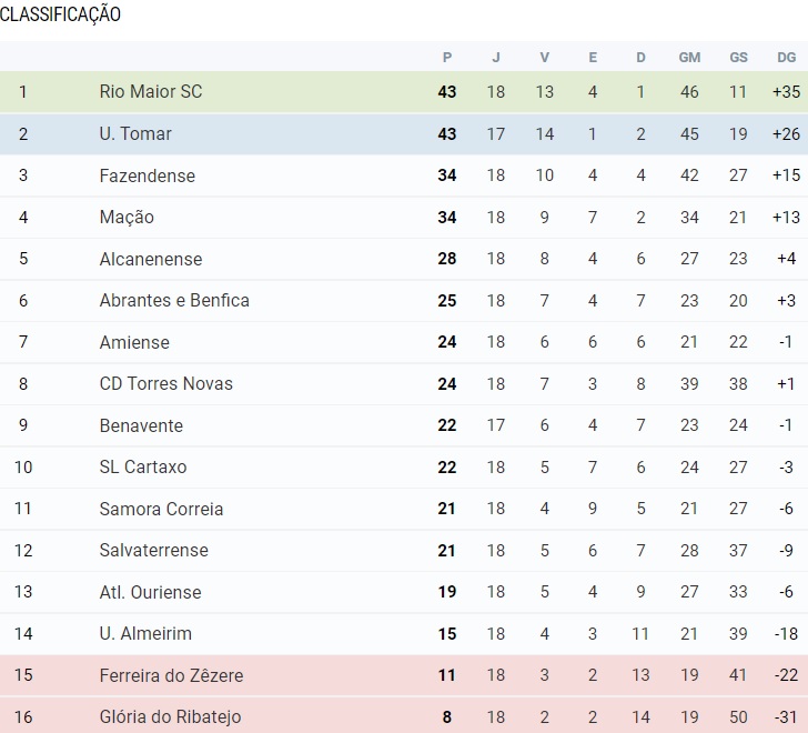 O União de Tomar e o Rio Maior perderam os seus jogos na 18ª jornada da primeira divisão do campeonato distrital da Associação de Futebol de Santarém, mas continuam firmes na luta pelo título.