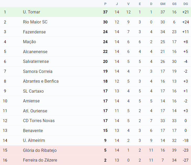 Com praticamente metade do campeonato da primeira divisão distrital da Associação de Futebol de Santarém decorrido, o União de Tomar segue líder e só sabe vencer desde o passado mês de Outubro, mês onde sofreu a única derrota frente ao Samora Correia e um empate frente ao seu principal concorrente na classificação, o Rio Maior.