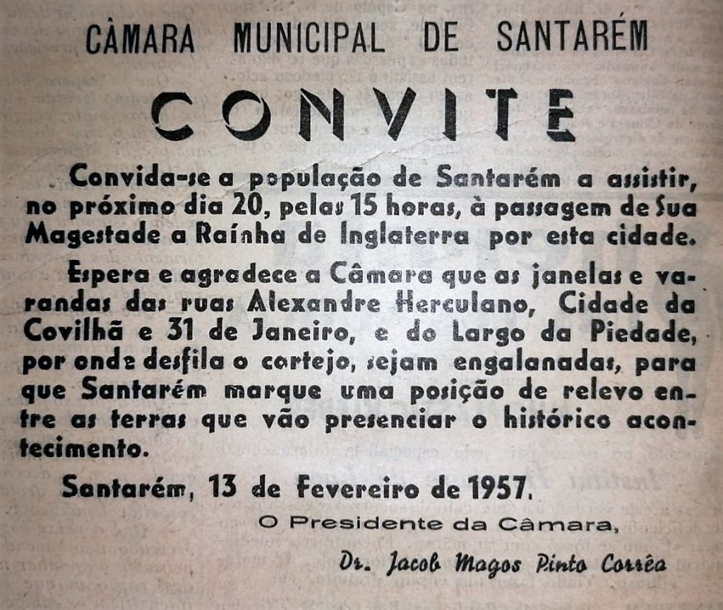 A 13 de Fevereiro de 1957, o presidente da Câmara de Santarém, Jacob Pinto Côrrea mandou publicar no ‘Correio do Ribatejo’ um convite à população empenhado em que esta assistisse “à passagem de Sua Majestade a Rainha de Inglaterra por esta cidade.”