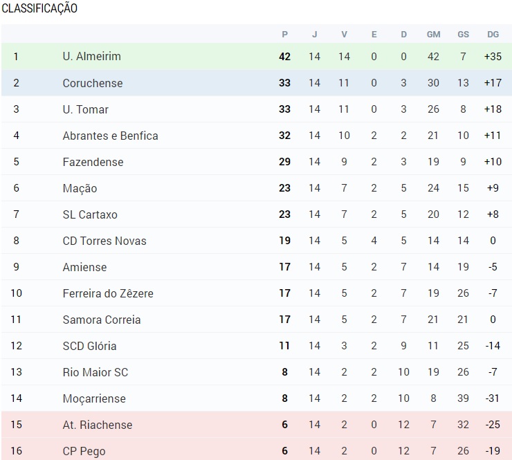O União de Almeirim continua a ser a equipa sensação do Campeonato Distrital da primeira divisão da Associação de Futebol de Santarém com um pleno de vitórias em 14 jogos realizados. Os almeirinenses aproveitaram a vitória do Coruchense sobre o União de Tomar e aumentaram a distância em nove pontos para o segundo classificado.