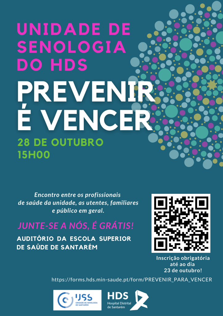 A Unidade de Senologia do Hospital Distrital de Santarém (HDS) vai realizar um encontro entre os profissionais de saúde da unidade, as utentes, seus familiares e o público em geral, subordinado ao tema “Prevenir é Vencer”, no dia 28 de Outubro, pelas 15h00, no Auditório da Escola Superior de Saúde de Santarém. Uma iniciativa que decorre no mês dedicado à prevenção do cancro da mama.