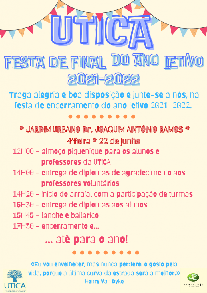 Universidade da Terceira Idade do Concelho de Azambuja vai assinalar o encerramento do ano lectivo 2021/2022 em festa. A iniciativa terá lugar no dia 22 de Junho, quarta-feira no Jardim Urbano Dr. Joaquim A. Ramos, em Azambuja.