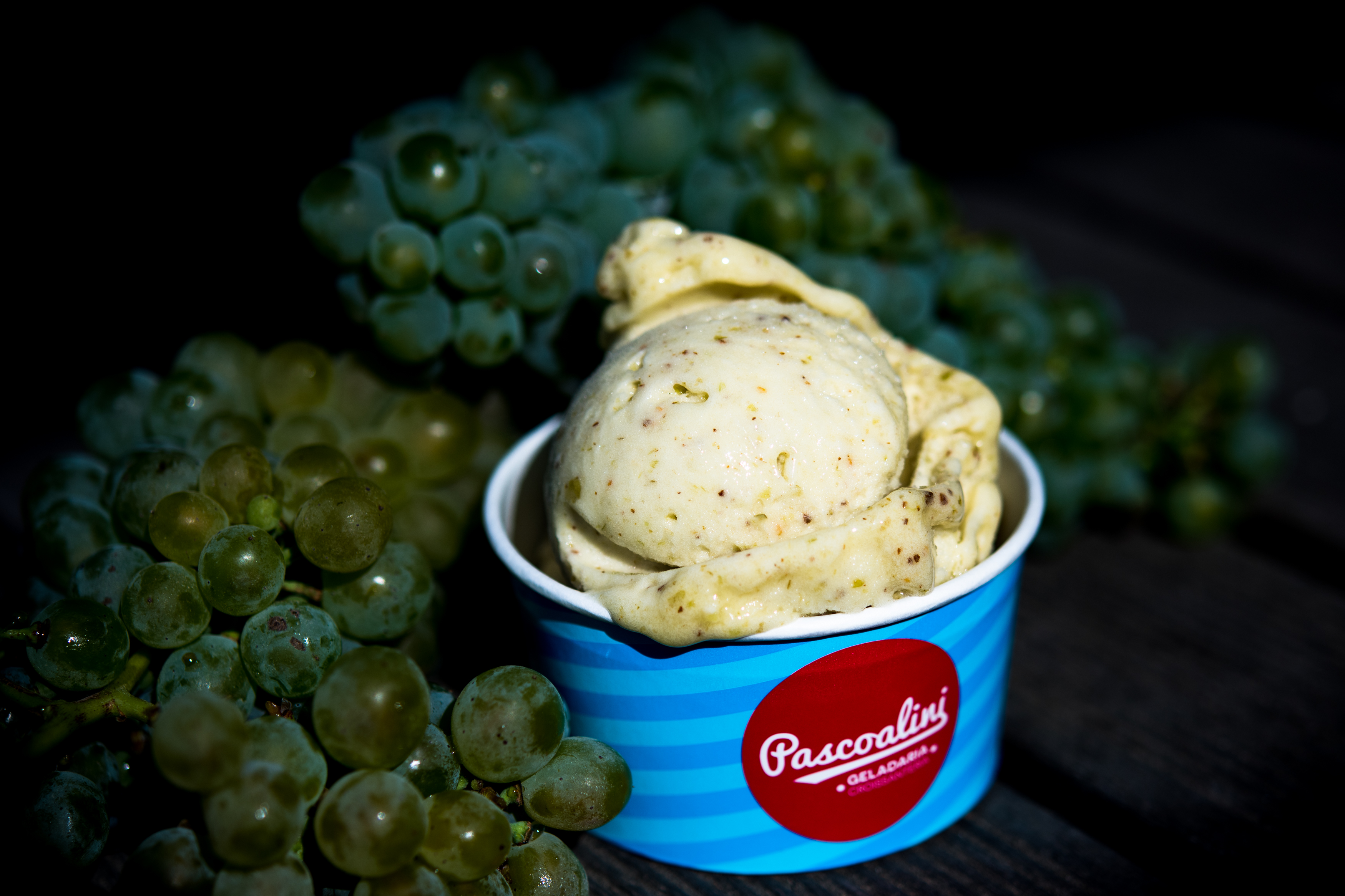 O resultado é um delicioso sorvete, com verdadeiro sabor a “uva de vinho”. Destaque para o facto de ser confeccionado, propositadamente, com grainha (que se sente, mas de forma suave), a fim de lhe conferir um lado mais vitícola. A ideia é sentirmos que estamos a comer um gelado de uva de vinho! E isso não quer, em nada dizer, que haja presença de álcool. Não se trata de um gelado de vinho – como é o caso do que a Pascoalini criou, em parceria com a Quinta da Alorna (também do Tejo), à base do seu Abafado 5 Anos. Estamos a falar de um sorvete de fruta, com cerca de 35% de Fernão Pires do Tejo, a juntar a água, limão, açúcar e dextrose.