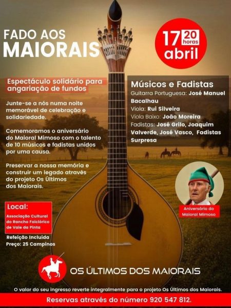 A Associação Cultural do Rancho Folclórico de Vale da Pinta, no concelho do Cartaxo, vai receber o espetáculo solidário ‘Fado Aos Maiorais’ esta sexta-feira (17 de abril), às 20h00.