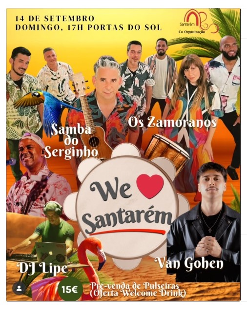 Os ritmos da MPB, do samba e do pagode vão invadir o jardim das Portas do Sol, através do evento ‘We Love Santarém’ que pretende trazer à cidade “música alegre, cores vivas, bom ambiente e uma vista linda sobre o Rio Tejo”, refere a organização nas suas redes sociais.